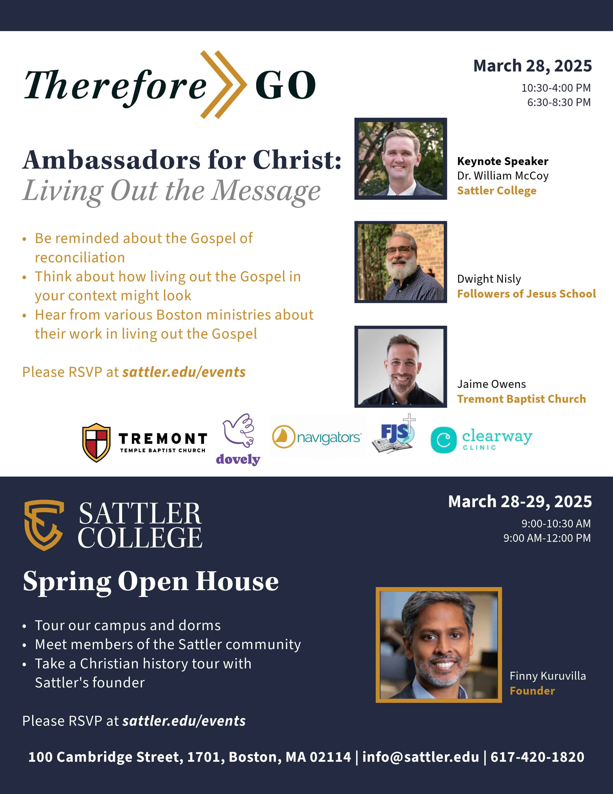 - We’re hosting our annual Therefore Go event, Ambassadors for Christ – Living Out the Message. The event runs from 10:00 AM at Sattler’s campus to 9:00 PM at Tremont Temple, featuring speakers, workshops, and concluding with a sermon and worship in Converse Hall. While designed for our Boston Sattler community, visitors are welcome! Register Here.